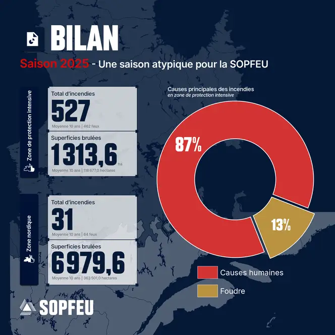 Québec, le 11 novembre 2025 – L’année 2025 aura marqué la SOPFEU par une répartition temporelle des incendies inverse aux statistiques habituellement observées. Le début de la saison, caractérisé par des précipitations abondantes, s’est traduit par un nombre d’incendies trois à quatre fois sous la moyenne. Toutefois, la situation s’est renversée à l’automne, alors qu’un nombre de feux exceptionnellement élevé s’est produit en raison d’une sécheresse prolongée.